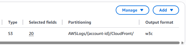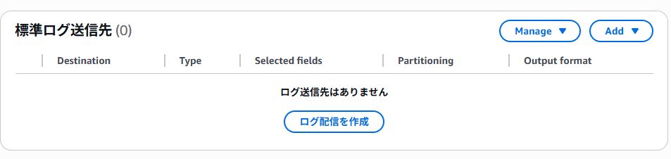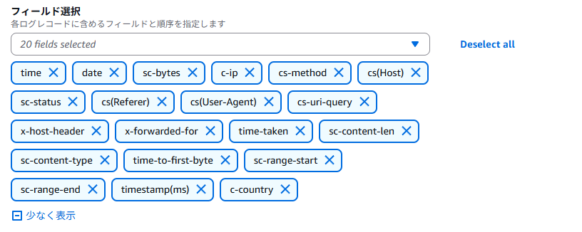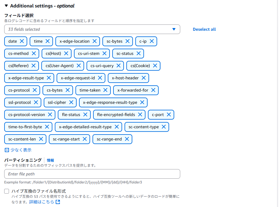 S3 バケットを選択すると、ログとして出力するフィールドも必要なので、精査していきます。これが恐らくデフォルトの設定です。