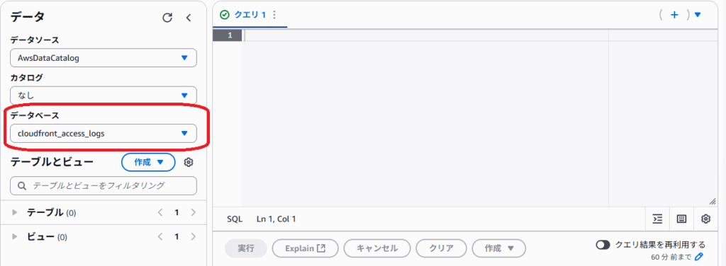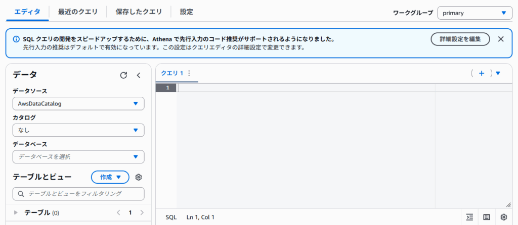 まずは、Athena の画面を開くと、エディタ画面が出てきます