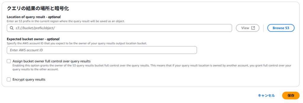 その上の方に、設定とあるので、ここでクエリ出力の結果を保存するバケットの設定をしてあげます。