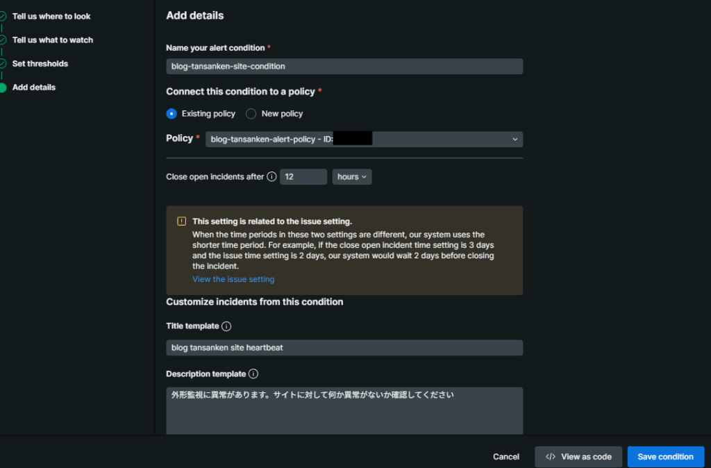 what to watch を次に設定しましょう。なにを監視したらいいですかみたいな意味です。自分が先ほど設定したサイトのpolicy です。