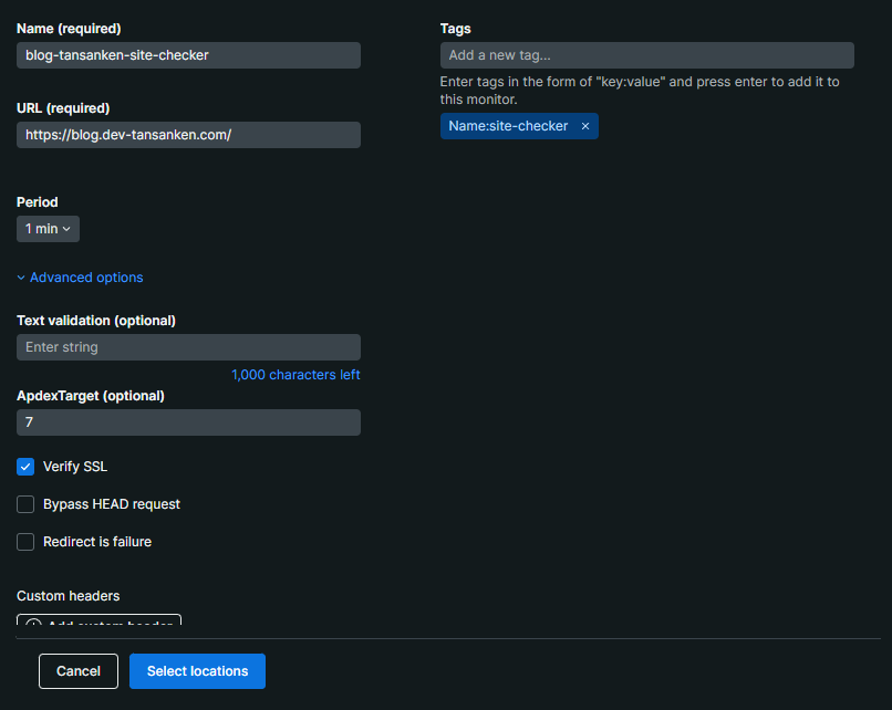 後でわかりやすいように、tag をつけておくと管理が簡単になるかもしれません。Custom header でBasic 認証もできそうなので、Basic 認証かけた状態のサイトの場合はCustom header で設定できそうです。