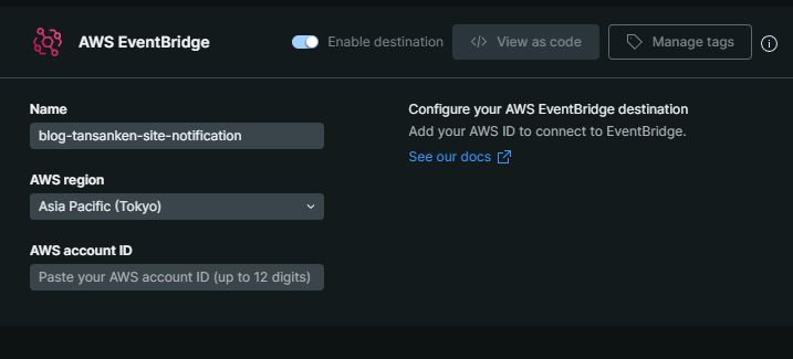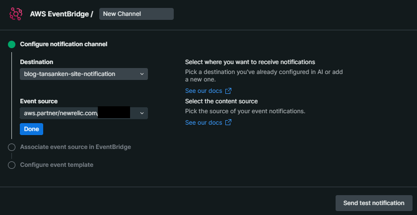 Associate event source のところで、AWS Eventbridge の方に移動すると、パートナーイベントソースに紐づけようとしていますので、選択して、紐づけてあげてください。