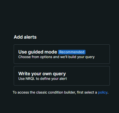 alert の設定方法には、自分でquery を組んでいくパターンと、ガイドでstep by step のものがあります。今回は、Use guided mode を使用していきます。