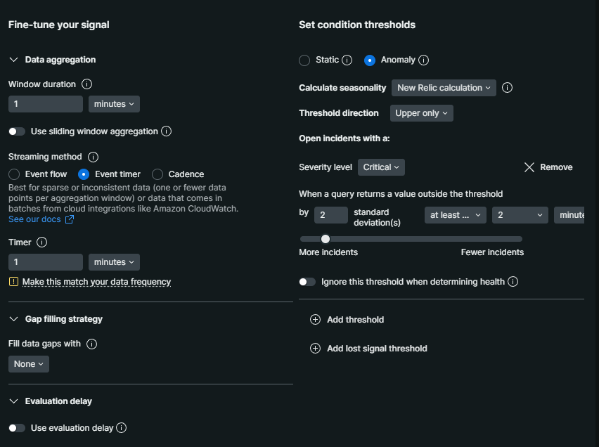 外れ値があったら、2分間の間に一回でもあったら、アラートを鳴らすように設定します。ちょっと厳しいですね。standard deviation なんて懐かしい響きですが、標準から2 外れるとアウトということですね。最初は厳しく後から、緩くです。