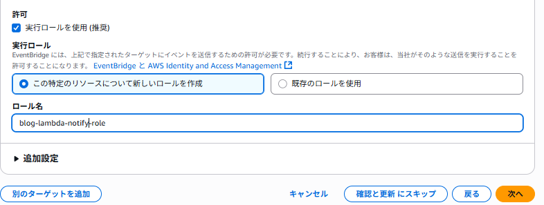 他のところは、そのままの設定で大丈夫です。これで、Lambda の連携は完了です。