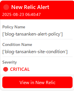 こんな感じで通知されます。View in New Relic を押したら、New Relic のコンソールに移動できるみたいな感じです。Policy Name がダサいのがちょっと残念ですね。もうちょっと改善の余地ありです。