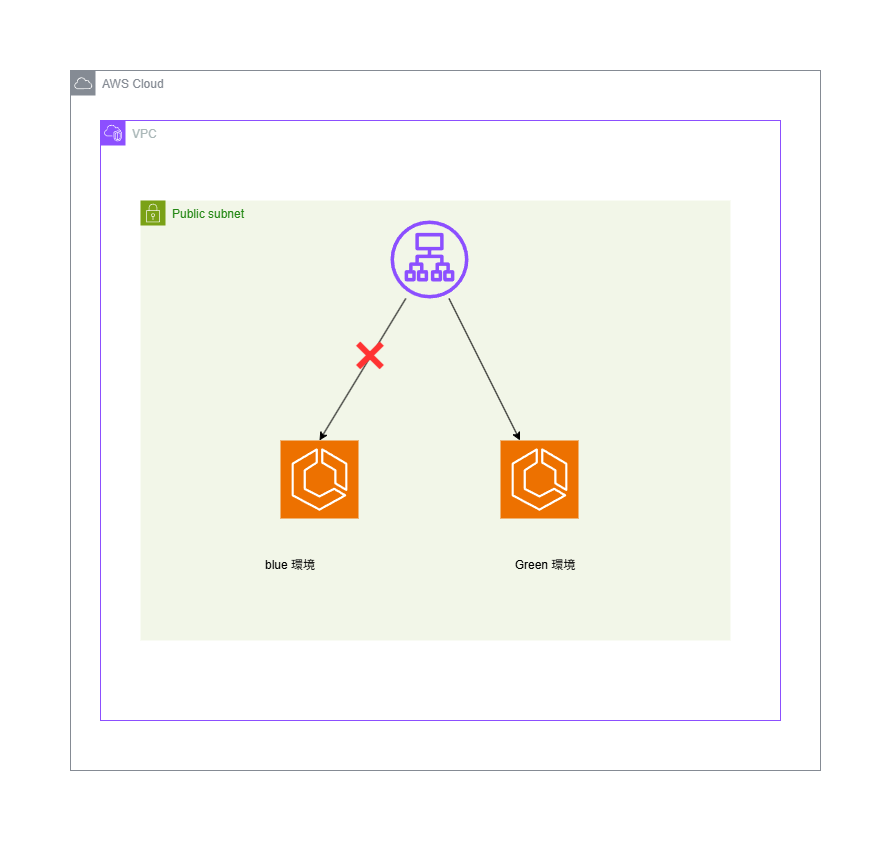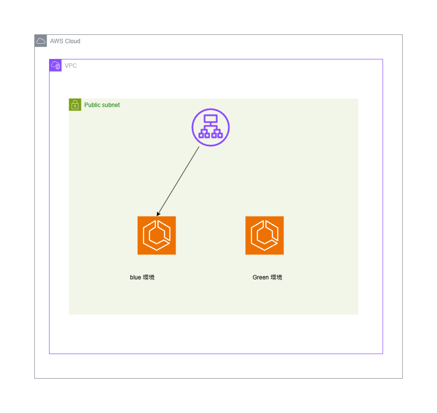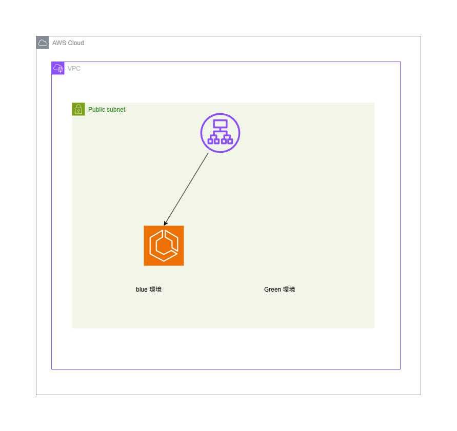 これが最初の状態です。Blue 環境のみ存在して、Green 環境はデプロイが発生していないので、ない状態です。トラフィックもBlue のみです。