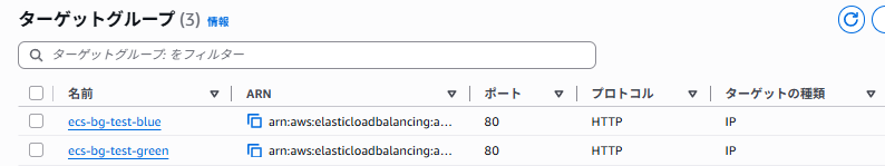 ターゲットグループもblue とgreen のターゲットグループが作成されていますね。blue とgreen の両方が紐づけられる状態になります。