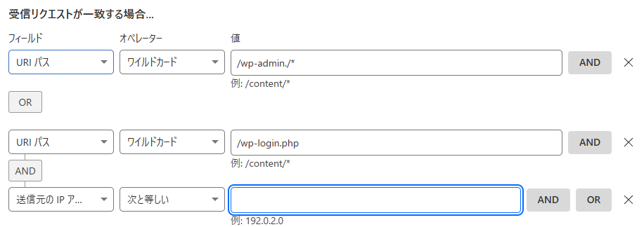 式ビルダーで作成してみようとしたのですが、条件がうまく作成できませんでした。どうやっても、IP を許可の所が端的に表現することが難しかったです。
