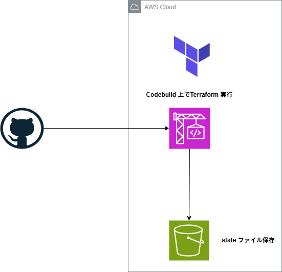 Terraform をCodebuild で実行できるようにする構成です。ソースはGithub から取得することを前提に書いています。