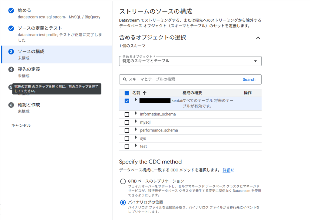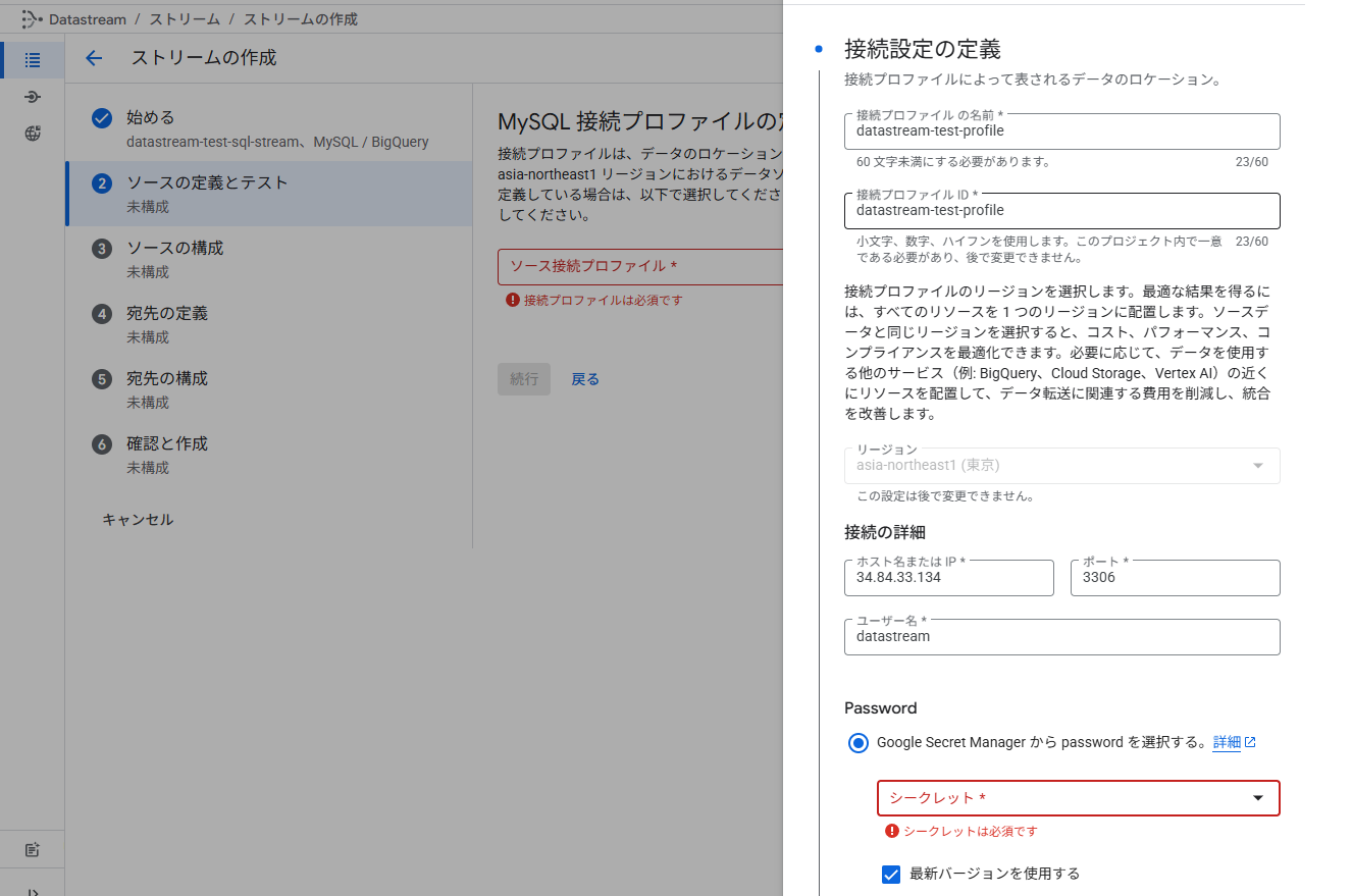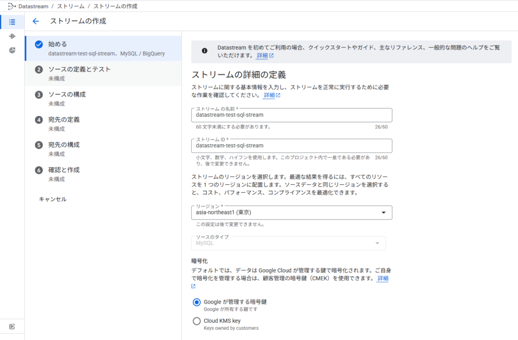 Cloud SQL と接続するストリームの名称やデータのソースタイプを設定していきます。今回はMySQL を使用しているので、MySQLがソースタイプです。