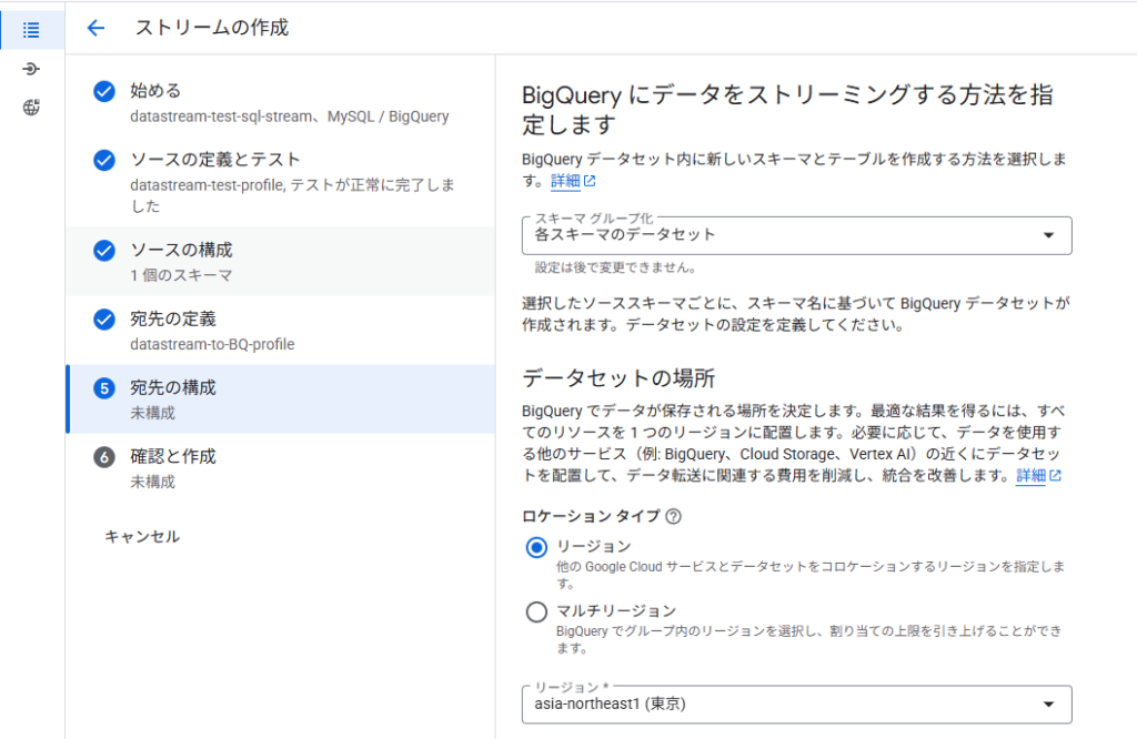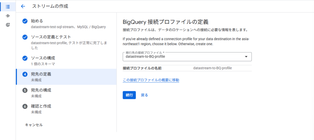 Datastream とBQ の接続のためのプロファイルを作成してあげます。ここでは名称しか設定していないので、現段階では知っておくべき設定などはないです。
