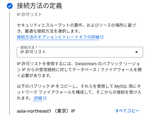 プライベート接続やSSH 接続などがあります。今回はIP 許可をして、接続していきます。