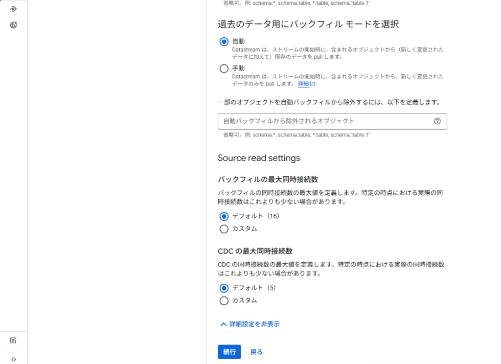バックフィルなどや同時接続数などの定義をしていきます。同時接続数によって、スピードなども変わると思いますので、この辺は運用で調整していく必要がありそうですね。