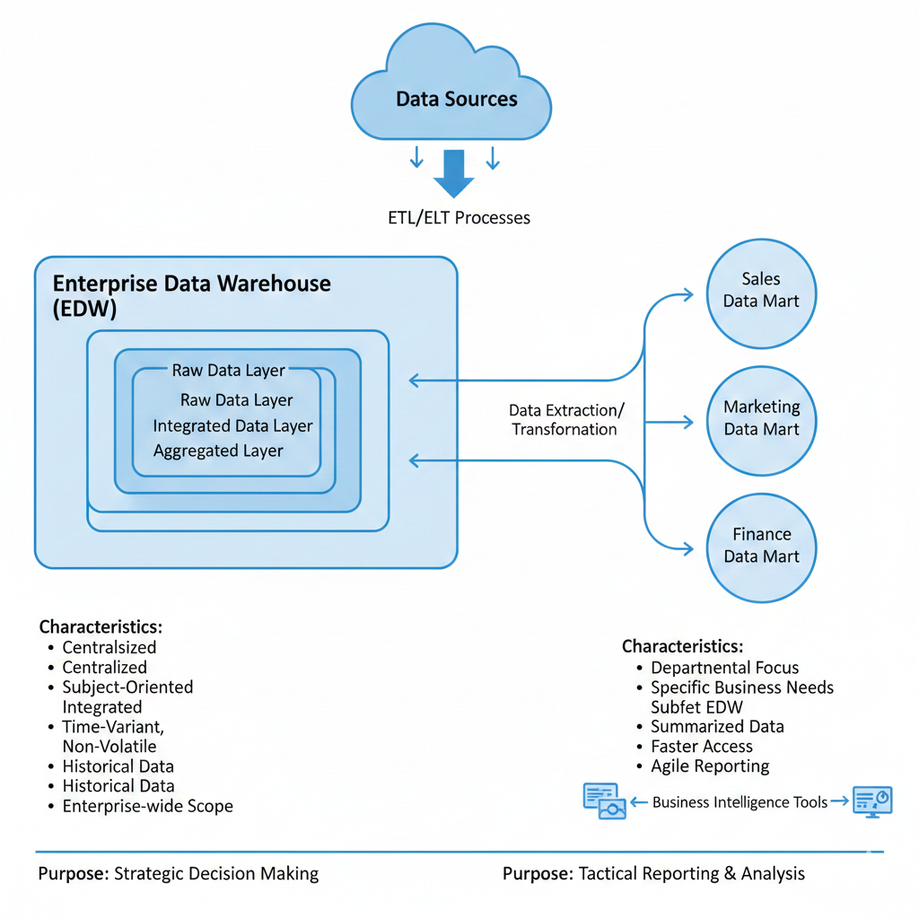 データマートを作ることによって、これは経理部とか営業部が使うデータみたいな感じで用途が分けれるようになっています。下の画像はGemini に作成してもらいました。下記の図のようにSales(営業)とMarketing とFinance (経理とか?)のデータなどの用途に分けることによって、被ることなく分析ができるようなイメージです。