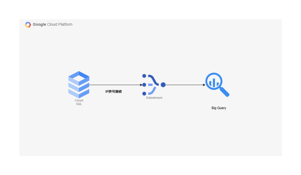 Cloud SQL に持っているデータをDatastream を通して、Big Query に保存するというのが今回の環境になります。
