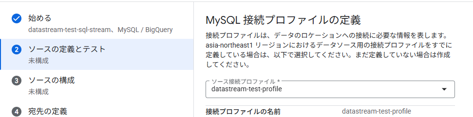 Cloud SQL と接続するストリームの名称やデータのソースタイプを設定していきます。今回はMySQL を使用しているので、MySQLがソースタイプです。