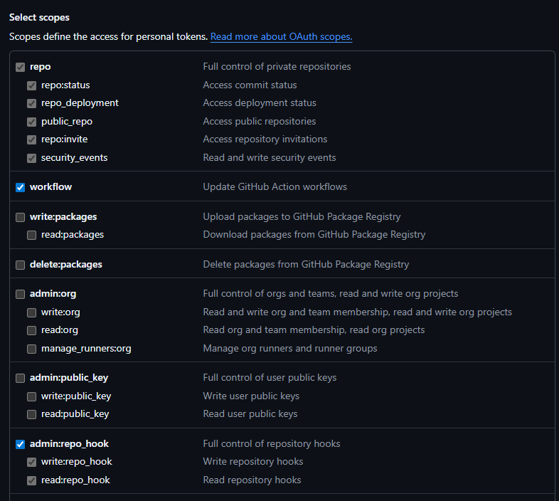 workflow の権限はとrepo の権限があれば、大丈夫だと思います。